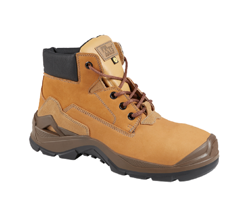 The MTS S3 Tech Score Flex safety shoes are high-performance outdoor work boots crafted from premium brown full-grain nubuck leather.
