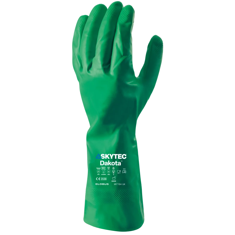 Protect hands with Skytec Dakota Nitrile Gauntlets. Superior chemical resistance and tractor-tread grip. Ideal for industrial cleaning. Shop now!